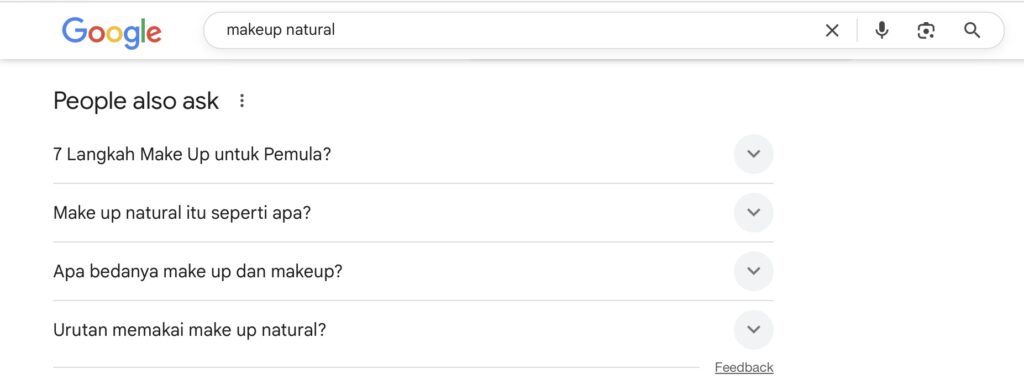 • Contoh: ketik “cara merawat makeup tahan lama” → muncul pertanyaan-pertanyaan terkait.